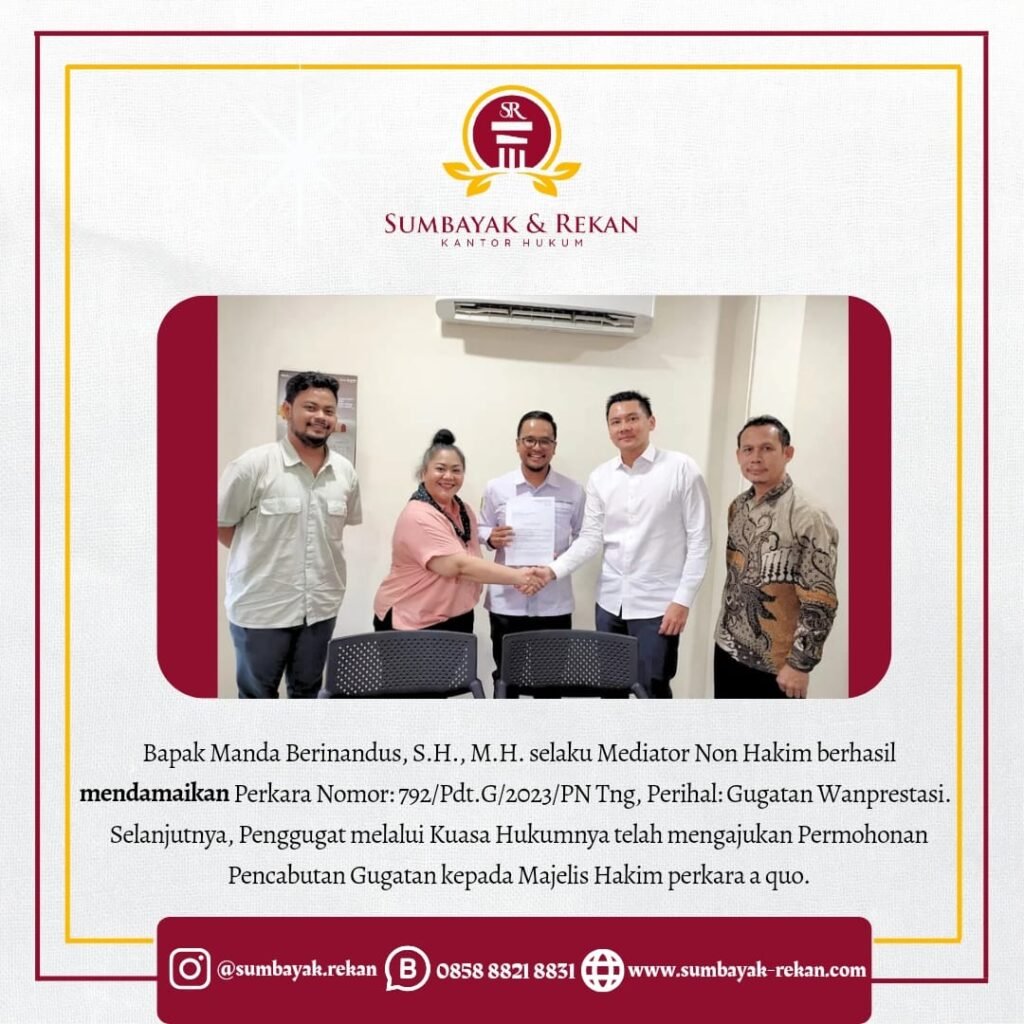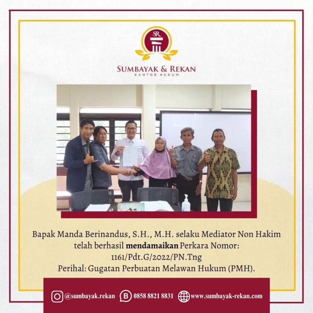SUMBAYAK & REKAN merupakan suatu Persekutuan Perdata (Maatschap) yang didirikan dihadapan Notaris dan yang dibentuk oleh Para Advokat yang telah mempunyai pengalaman dalam menangani permasalahan-permasalahan hukum yang dihadapi oleh orang pribadi maupun badan hukum serta menyelesaikan perkara melalui jalur litigasi, non litigasi dan Mediasi. Keberadaan dan eksisnya Kantor hukum SUMBAYAK & REKAN didukung oleh Para Advokat yang handal serta mempunyai pengalaman, skill dan pengetahuan hukum, mempunyai kemampuan dalam menemukan solusi hukum.